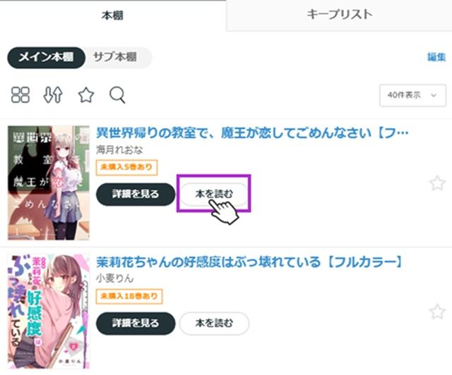 ①本棚に表示されている作品の「本を読む」ボタンをタップし、各巻の一覧ページに遷移する