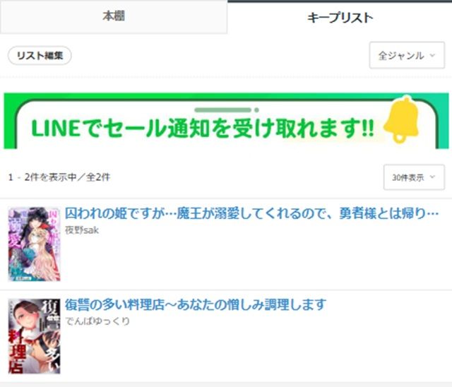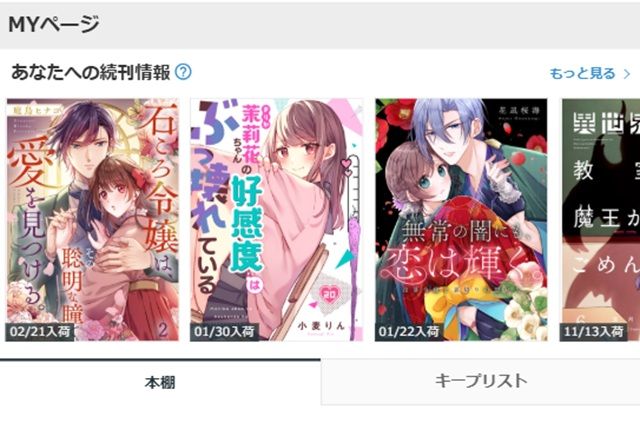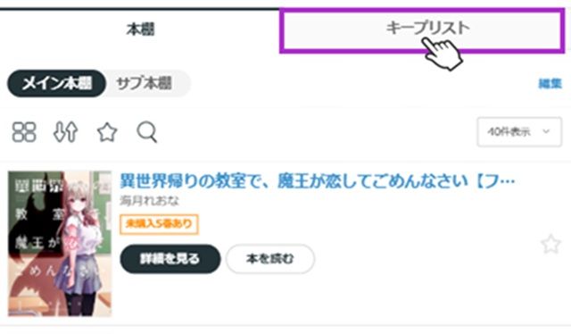 ①「本棚」タブの隣にある「キープリスト」タブをタップする