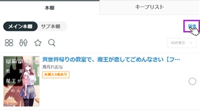 以下の手順でMY本棚から作品の削除およびサブ本棚へ移動することができます。