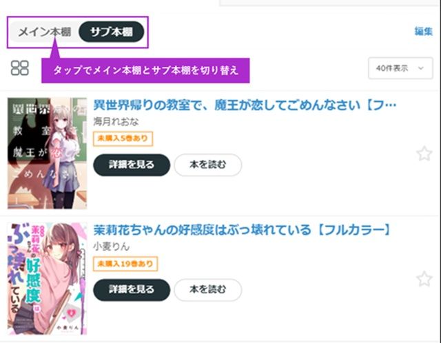 また「サブ本棚に移動」ボタンをタップで、選択した作品がサブ本棚に移動されます