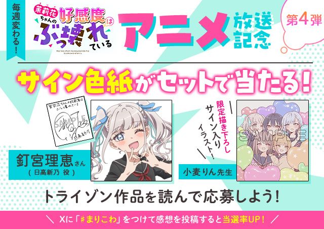 「茉莉花ちゃんの好感度はぶっ壊れている」のアニメ放送を記念して、「毎週変わる!声優サイン色紙×作家描き下ろし色紙 プレゼントキャンペーン」を開催します!